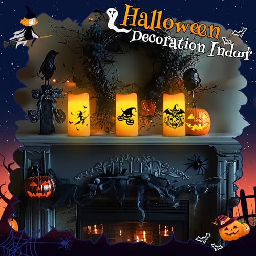 Halloween Decorations Indoor: Grow to be your dining table/window into a Halloween spectacle with these flickering flameless candles. Each candle features realistic flickering lights and double-sided decals with classic Halloween motifs, including skulls, spider webs, crows, pumpkins, and bats. Ideal for any Halloween table setting, they provide an eerie glow that may be sure to impress your guests.