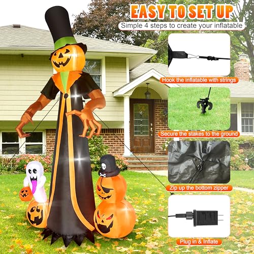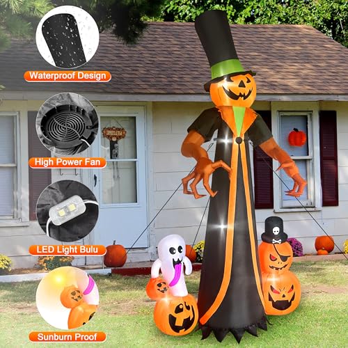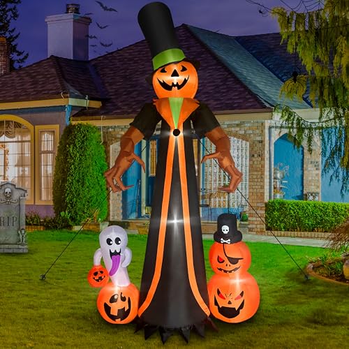 【Eye-Catching Design】This Halloween, our meticulously crafted 10-foot tall inflatable pumpkin man will undoubtedly become the center of attention. Adorned in a magnificent cloak and sporting a towering wizard hat, it stretches out its razor-sharp claws, exuding an imposing presence. Meanwhile, playful and mischievous ghosts, along with adorable mini pumpkins, closely accompany it, collectively creating a rich and unique festive atmosphere in your yard.