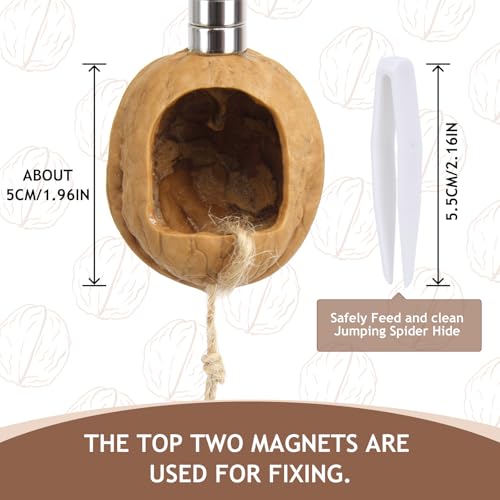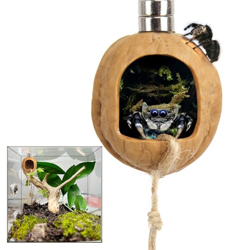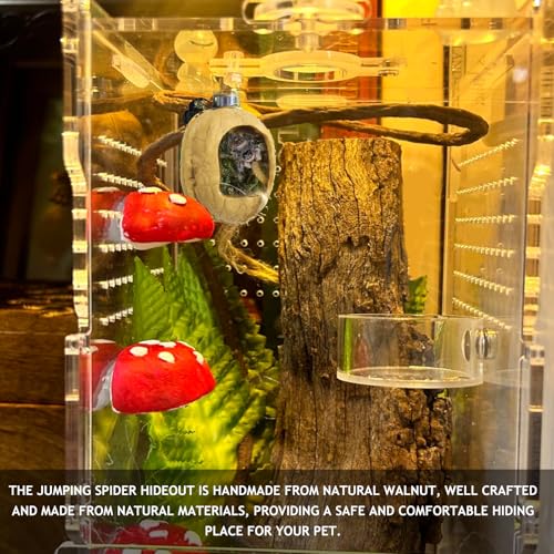 Walnut Enclosure: Our jumping spider enclosure is meticulously handmade from natural walnut skin,providing a sturdy and unbreakable habitat. Each walnut hide offers unique door typet-shaped openings,fit jumping spiders to shelter, play, and breed