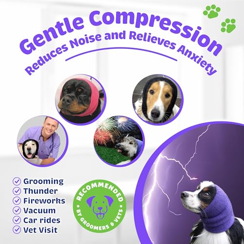 DESIGNED IN THE USA, HAPPY HOODIE IS LONG-LASTING; QUICK AND EASY to use and clean; machine washable; an economical calming aid for dogs to help relieve anxiety. Keep your dog’s ears and head warm in cold weather, or wet it to keep your pet cool when it’s hot! Our soft, expandable, double-ply fabric band comes in 4 sizes to accommodate most dog breeds.