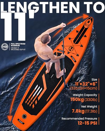 🧡ULTRA LIGHT SUP | Inflated 11’ x 32” x 6” , weight ONLY 17.3 lbs that made you easy to carry. Maximum capacity is up to 330 lbs, stable and great for all skill levels and conditions. 11’ SUP is specially designed for speed and provides extra room, because of this You’ll enjoy the wonderful paddling experience with your friend, kid or pet.
