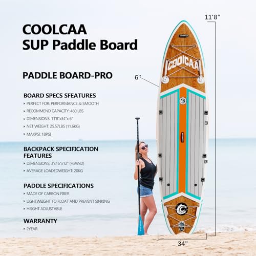 【PREMIUM QUALITY DETAILS】:COOLCAA’s paddle boards are made of the highest grade materials and are wider and larger in size than other inflatable pulp boards. The maximum weight capacity is up to 460 lbs! This can be a durable and stable paddle board for adults of all skill levels, allowing you to bring your family or pets along. From the design to the manufacturing process, COOLCAA ensures that every detail of the paddle board meets high standards.