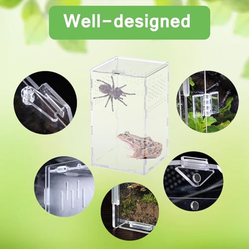 UNIQUE STACKBLE DESIGN: Frog tank molded base holds water or substrate without leaking,Locking handle and designed to keep your pet secure Easy to assemble when needed, or disassemble and store when not neededLocking handle and designed to keep your pet secure. Clear Acrylic terrarium kit for kids great for temporary housing or quarantine Ideal to transport terrarium animals or live foods.