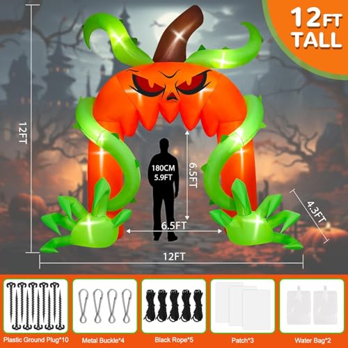 – This Halloween pumpkin inflatable features red eyes, and claw vines for an impressive look right through the day or night. Our inflatable arch comes with 10 fixing stakes and 4 ropes, which provide additional anchoring points to ensure the arch stays firmly in place even in adverse weather conditions.