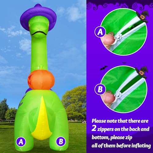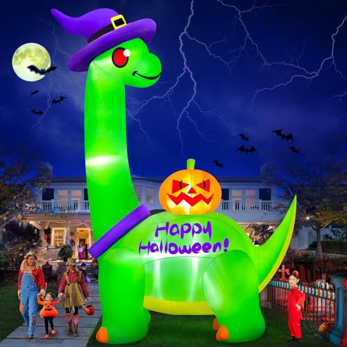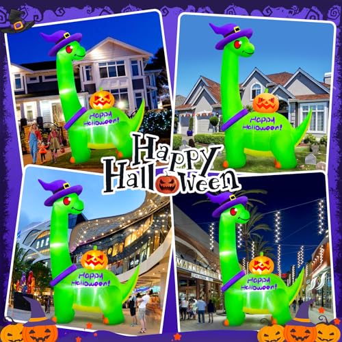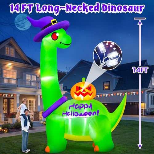 Amazing Halloween Decor: 14-foot long-necked dinosaur outdoor decor has a witch hat and small pumpkin, built-in bright LEDs, looks great at night and has quite a few light. We use top quality lights for long lasting use. You’ll place Halloween inflatable outdoor decoration outside, front porch, patio, mall, Halloween party, celebration, birthday. Have fun building a beautiful and fun house for kids to celebrate Halloween