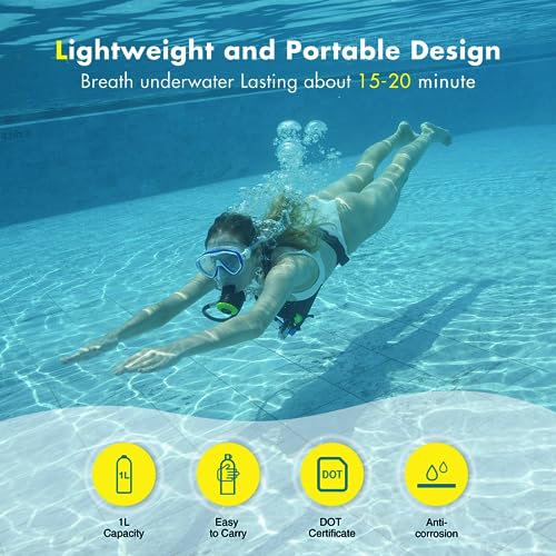 🏝️【15-20mins Underwater Experience】Chikadiv mini scuba tank has 1L capacity. You’ll stay up for 15-20 minutes underwater with total freedom. The usage time will be affected by external factors such as temperature, diving depth and breathing rate.