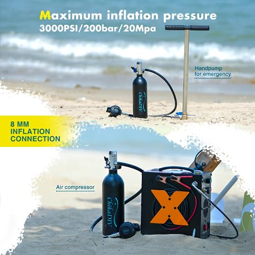 🏝️【Various Inflation modes】The 8mm one-way inflation valve of scuba diving tank can connect the refill adapter to fill up. Usually, you can use a bigger bottle to guide vials. Also, you can use the high-pressure hand pump or electronic pump. Using the hand pump is a little difficult for us, so it is just as the alternate inflation method. The electronic one takes about 15 minutes. In addition, if there is a diving store, you can ask for help.