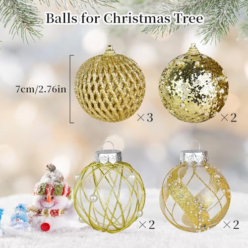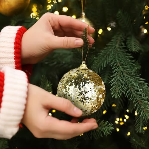 PACKAGE INCLUDES – 9 x Mupera glitter sequin gold ornaments for christmas tree with sparkling sequins, each ornament measures 2.8 inches (Shatterproof christmas ornaments 70mm).
