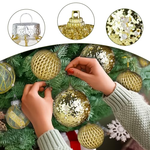 EASY TO HANG – Every christmas ornaments set comes with pre-installed rope loops, making the Mupera gold christmas ornaments easy to hold and attach to christmas tree branch garlands or other decorative arrangements. (Quickly eliminates after use).