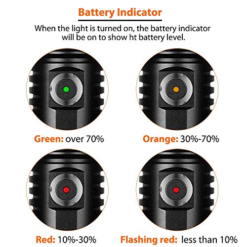 Battery Power Indicator: The built-in remaining battery indicator at the side switch of the light means that you can know the actual-time battery level. When the light is turned on, the battery indicator would show status of battery power. Green: ≥70%, Orange: 70% ~30%, Constant red: <30%, Flashing red: <10%.