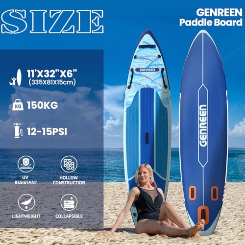【GENREEN paddle board STABLE & EXTRA LONG/WIDE】 GENREEN SUP inflatable paddle board the most stable paddle board available on the market. It’s easy for beginners to rise up and balance on the Sup board. The wide, advanced shape and no-slip deck make it easy for fast, fun paddling for all skill levels, perfect for the use of in the ocean, lakes and rivers. You’ll also fishing on the paddle board. It is an ideal all round paddle boards for adults, teens, youth and with pets of all skill levels.