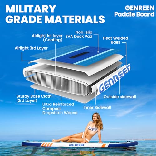 【Why Choose GENREEN paddle board】①Non-slip deck is upgrated.②Sup board paddle is adjustable.③Two bungees.④Nylon-made grip⑤High quality valves do not leak air⑥Dual-action pump⑦Higher stability⑧Military grade material⑨4-layer structure⑩D-Ring for seat.⑪14 D-rings ⑫5 Grips.⑬3 Fins