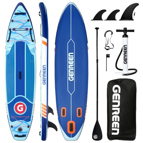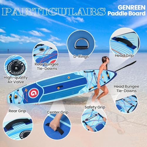 GENREEN paddle board inflatable comes with the entire necessary sup accessories to get started in no time, including 1 adjustable paddle, 3 detachable fins, 1 safety leash, 1 pump, 1 sup backpack, 1 waterproof phone bag. Add functionality such as installing a kayak seat for fishing, securing a cooler or connecting with other paddleboard through these D rings.