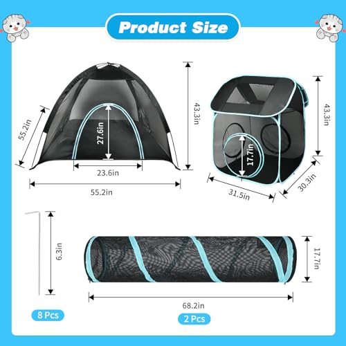 🐱4-in-1 Cat Fence – Includes 1* House Shape Cat Tent (31.5″ x 30.3″ x 43.3″), 1* Large Tent (55.2″ x 55.2″ x 43.3″), 2* Pet Tunnel (68″ x 17.7″). Cat tents and cat tunnels can be used together or separately. The spacious room is perfect for cats, rabbits, guinea pigs, ferrets and other small animals.