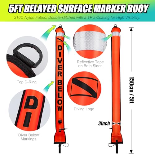 🏊EASY TO INFLATE & RELEASE – Simply oral inflator or with your octo regulator through the open bottom. With an overpressure relief valve to allow the tube to ascend without rupturing, and just manual pull the OPV for quick release and fast complete deployment in any situation.