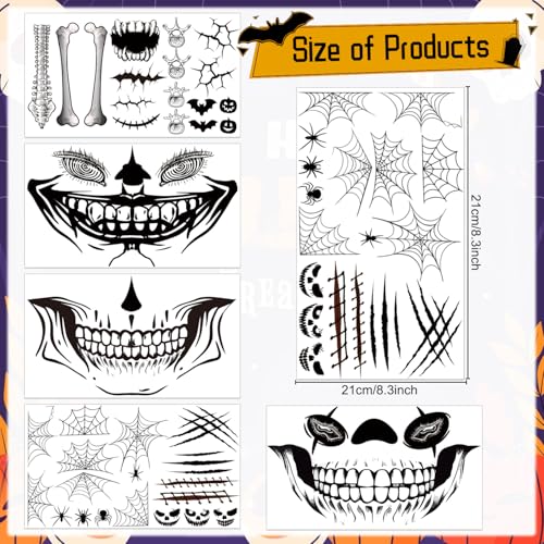 Horror Tattoo Set: Super cool face tattoos 6 pieces set, 4 are big mouth tattoos, 2 small spider web, wound, bat, mouth tattoos, mouth tattoos make it easy for you to have different horror makeup!