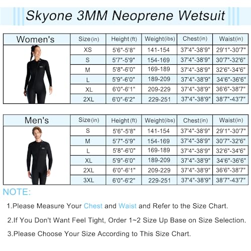 ★SIZE SUGGESTION: Skyone 3MM wetsuit women men are designed to fit a little tight to provide maximum insulation, it should fit very tightly when dry and will be looser when immersed. When choosing your size, please match your chest waist and hip first
