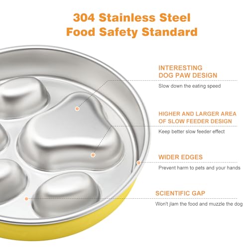 Yellow Non-slip Case and Anti-rust Design Dog Bowls:Dog Slow feeder Bowl has a non-slip silicone rubber case, preventing it from sliding or tipping over and provide stability, making it easier for your dog to eat, also protecting your floors from scratches, spills and messes,besides the yellow color is a dog’s favorite color as well as you.Metal stainless steel rust-resistant process design can ensure that the slow feeder dog bowls has a longer stand years of use.Suitable for slow feeder dog bowls small & medium sized dogs.