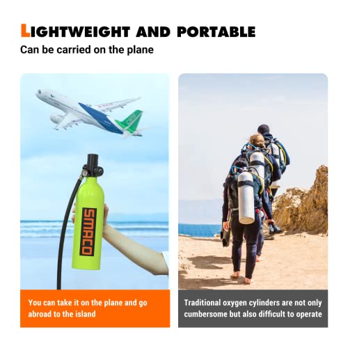 UP TO 20 MINS DIVE TIME: SMACO S400 Plus has a capacity of 1 L and can give up to 20 mins of diving time.At the same time, the scuba tank has double-layer filtration device, which effectively prevents the entry of dust and impurities, making the inhaled gas cleaner
