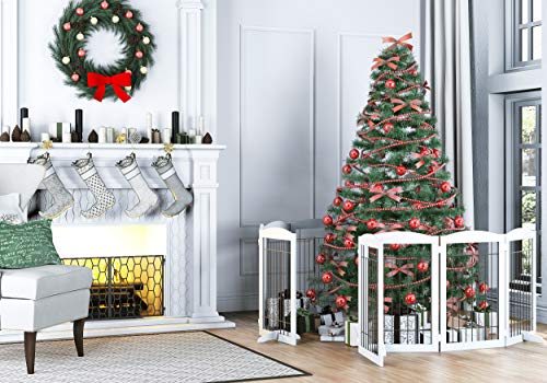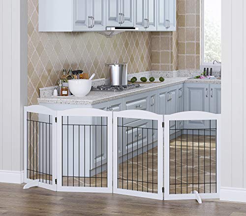 FOLDING AND EXPANDABLE DESIGN: This Pet Dog Fence is free standing and can be folded out into the wide Z-Shape allows you to use It in Full Hallways, Double Doors, or Standard Doorways, Bedrooms.