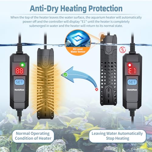 🐟【Overheating & Out of Water Protection】When the aquarium heater head out of the water, the heater will automatically stop heating, the controller will display the “E1” until the heater is completely submerged in the water. If the water temperature exceeds 34°C/94°F, the heater will automatically stop heating, and the controller will display the “HH” until the water temperature drops below 34°C/94°F.