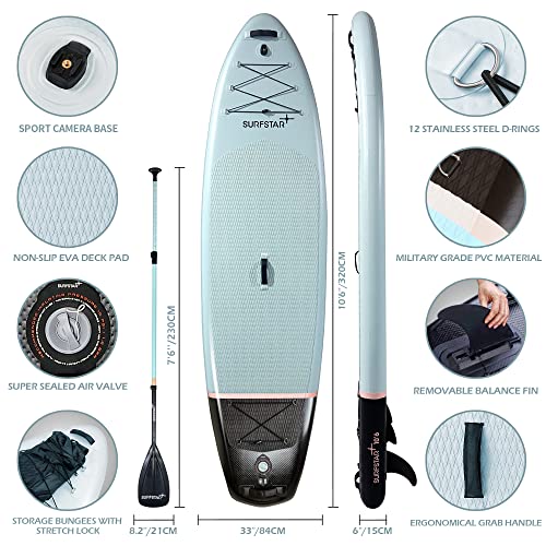 🏄 PORTABLE & LIGHTWEIGHT AQUA BOARD – With the central maintain You’ll be able to easily carry your paddle board to waterfront. This ultra-light 18.8 lbs (8.5kg) board is easy to inflate and deflate. You’ll be able to take your paddleboard anywhere with a body of water easily. Surf, yoga, fish, camping or take a seat back floating and enjoy the great outdoors. (Size:10’6”x33”x6”/320x84x15cm; Weight Capacity:320lb/145kg)