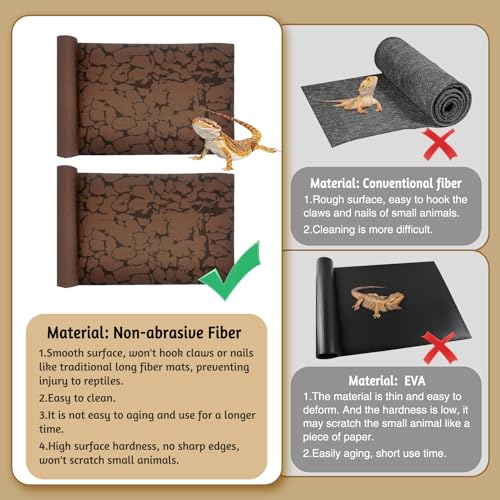 SAFETY MATERIALS:The reptile carpet is made from high quality non-abrasive material that is breathable. The surface is smooth and will not hook paws or nails like traditional long fibre mats, preventing injury to reptiles. The sand mats for bearded dragon are soft to the touch, comfortable for small animals such as leopard geckos, lazards, snake to walk or rest on, and impact resistant