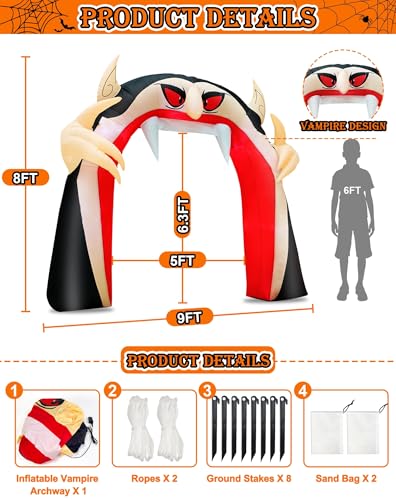 8 Ft Halloween Vampire Inflatable Archway Decoration: The set includes one Halloween vampire archway inflatable decoration, size: 8 Ft*9 Ft(L*W) , 8 ground stakes, 2 tethers, 2 sandbags.Designed with vampire pattern and sharp hands