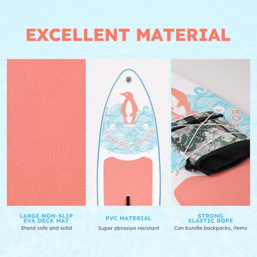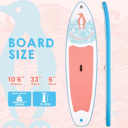 【Excellent Performance】Our inflatable paddleboards are made of high-quality, ultra-lightweight military-grade PVC material, which is 35% lighter than bizarre materials, bearing in mind smooth forward motion and steering on the water, and easy portability to rivers, lakes, oceans and other scenarios. Tuxedo Sailor paddleboards are durable enough to resist sunlight and sea water, and are suitable for long hours and long distances, so you’ll be able to have fun on the water.