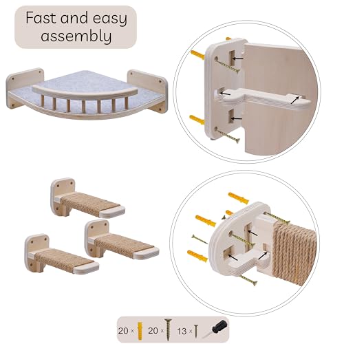 🖍️ UPDATED ROBUST & STURDY DESIGN – Designed to accommodate even the most adventurous cats, our cat perch wooden for wall offers an updated, reinforced and sturdy structure. With specially engineered support systems and an added guard rail, your furry friends can play, climb, and relax securely. Experience the epitome of durability and peace of mind. Rest assured knowing that the steps of our cat wall furniture can support a maximum load of up to 50lbs while the corner shelf can support up to 60lbs.