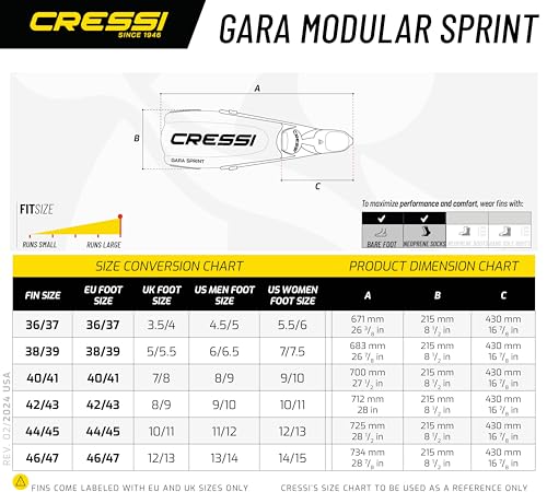 The Gara Modular Sprint fin is the new 2020 model a part of the Cressi Gara line. This can be a shorter version of the Impulse fin, which proved to be hugely popular with freedivers all over the world, both amateurs and the most demanding professional freedivers. This is also confirmed by the large number of articles dedicated to it by specialized journalists in sector magazines. Sprint is designed to meet the needs of freedivers and spearfishers who practice this sport in wintertime and when a fin so long as Impulse is not necessary. Both fins have been designed the usage of expensive finite element software programs that allow highly complex and equally high-performance sections to be defined. The blade of Sprint, like the Impulse blade, is made of a single thermoplastic elastomer, despite the fact that it would be more correct to refer to an angled sublayer and an overlay. The sublayer follows the shape and dimensions of almost all of the fin. It has a uniform thickness and a flexible longitudinal propulsion wing of variable length. In contrast, the so-called overlay covers the propulsion wing selectively and has a thickness that slopes from the maximum value to zero longitudinally towards the tip of the blade. In consequence, the fin offers a new way of storing and releasing elastic potential energy, greatly assisting the movement of the freediver’s legs and thus guaranteeing a net improvement in propulsive output. When disassembled, the blade and foot pocket occupy the space of a normal snorkeling fin. The Gara Modular Sprint is designed and manufactured n Italy by Cressi, an Italian brand pioneer in freediving, spearfishing, and scuba diving equipment since 1946. The product is covered by a 2-year limited warranty.