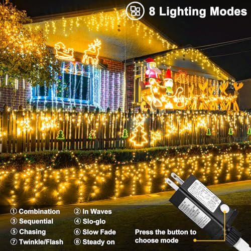 Upgraded 8 Modes LED Icicle Lights: The Christmas Lights have 8 selections of light pattern: 1.Combination 2.In Waves 3.Sequential 4.Slo-Glo 5.Chasing/Flash 6.Slow Fade 7.Twinkle/Flash 8.Steady On. Different lighting effects are controlled by the button on the plug. These beautiful and vibrant outdoor icicle lights will bring you a lot of festive atmosphere.