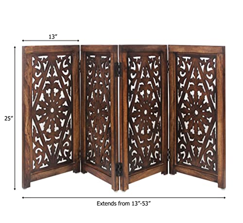 Four-Fold Construction – Four (4) pre-assembled wood Panels with floor protectors, each measures 13″W x 25″H x 1″ thickness. Overall dimensions – 53″ width x 25″ height. Each panel is secured to the adjacent panel with lead free powder coated metal hinges. Frame is solid mango wood making for a sturdy protection. Each inset is hand carved geometrical design. This four panel gate weighs 13 pounds.