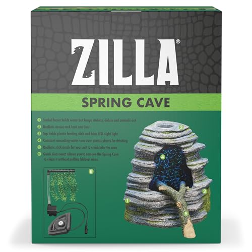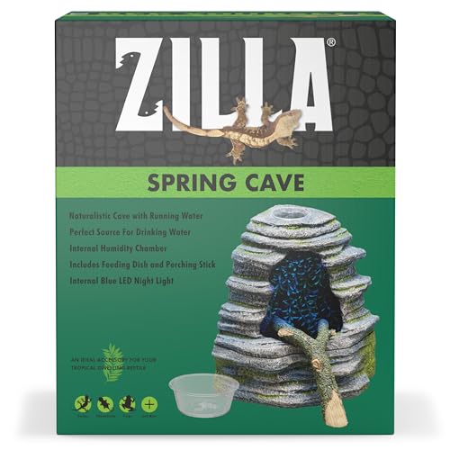 Not all reptiles and amphibians will drink from a water dish. Many drink all through rain storms in the wild and lick the running water from leaves as they drip. The Spring Cave mimics that dripping water allowing animals such as geckos and chameleons to drink from a running source. A large stick helps them climb into the cave to drink, and a blue LED permits you to see them at night. Amphibians will also love this internal rain chamber as it provides water to keep them hydrated and raises the humidity in the terrarium. Includes removable feeding dish which sits on top.