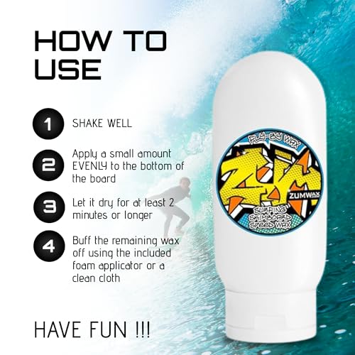 EASY APPLICATION: 1. SHAKE WELL 2. Apply a small amount EVENLY to the bottom of the board 3. Let it dry for at least 2 minutes or longer 4. Buff the remaining wax off using the included foam applicator or a clean cloth