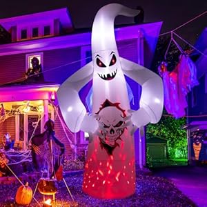 Halloween Inflatable Ghost – 12.5FT Tall Halloween Ghost inflatable Size: 12.5’H x 6.7’L x 3.5’W. Its hands rip open the belly to reveal a scary skull inside, accompanied by a spooky smile creating a terrifying Halloween atmosphere. NERVEOL Halloween Inflatable Flam Ghost is perfect for Halloween parties, haunted houses, and trick-or-treating events.