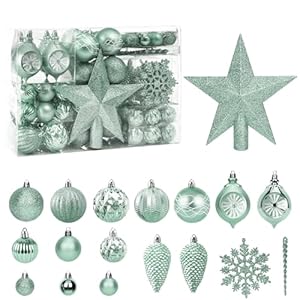 【Package】You will receive 1*tree topper, 8*snowflake decor, 19*different shapes of Christmas ornaments and 72*different sizes of Christmas balls, which are hanging on the Christmas tree and make the house full of holiday joy and happiness. The balls are equipped with string hangers and hooks. It is convenient to hang or take-down.