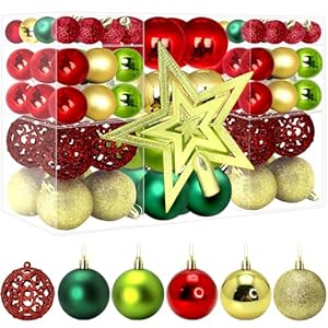 Christmas Ball Ornaments Set: Includes 100 pieces of variety shapes Christmas ornaments with gift package case are packed in transparent boxes of different sizes, and a gold Christmas tree topper star, Sufficient quantity and various sizes. Great for Christmas Tree Decorations, Will meet your party decoration and holiday needs