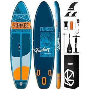 【DURABLE & STURDY】FUNKEE inflatable paddle board featuring military-grade drop-stitch construction. This durable and strong paddle board is designed to withstand challenging conditions, ensuring a reliable and thrilling experience for surfers, paddlers, and yoga enthusiasts alike. Choose our paddle board and embark on your next unforgettable water adventure.$179.9911’×34″×6″ Extra Wide Inflatable
