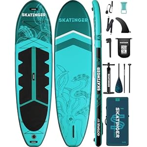 【HIGHLY DURABLE MATERIAL】 Non-slip EVA deck pad of the Skatinger inflatable paddle board is designed with a diamond pattern and an octopus shape, and can be inflated to a rock-solid hardness, allowing you to stand comfortably without fear. High-quality military-grade ultra-light PVC material and advanced needle-drop core tech ensure that the inflatable boards has higher compression resistance and elasticity, minimizing accidental injuries, making the ISUP extremely durable.$299.99$319.9911’x34” Extra Wide Inflatable