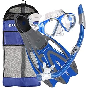U.S. DIVERS COZUMEL SNORKELING SET. An Electric Blue snorkel set with a 2-window mask, splash top snorkel with a one way purge valve, dual composite vented blade fins, and a mesh gear bag to keep everything organized