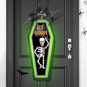 Sturdy Wooden Construction: Halloween front door signs made from durable wood, which can serve you for a long time, not easy to break or fade, this hanging plaque is designed to withstand windy conditions and stay securely in place on your door and yard$13.89$15.99Halloween door decorations Led Coffin Door